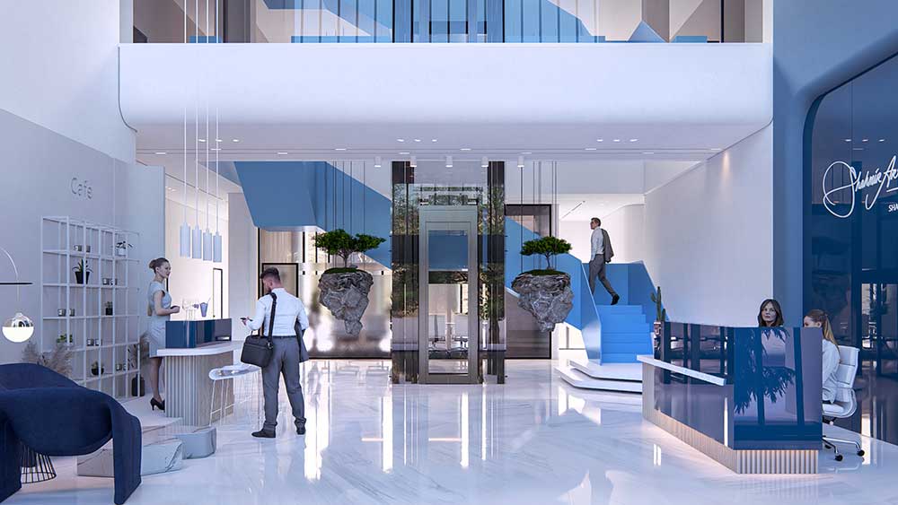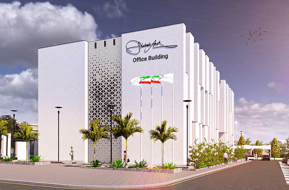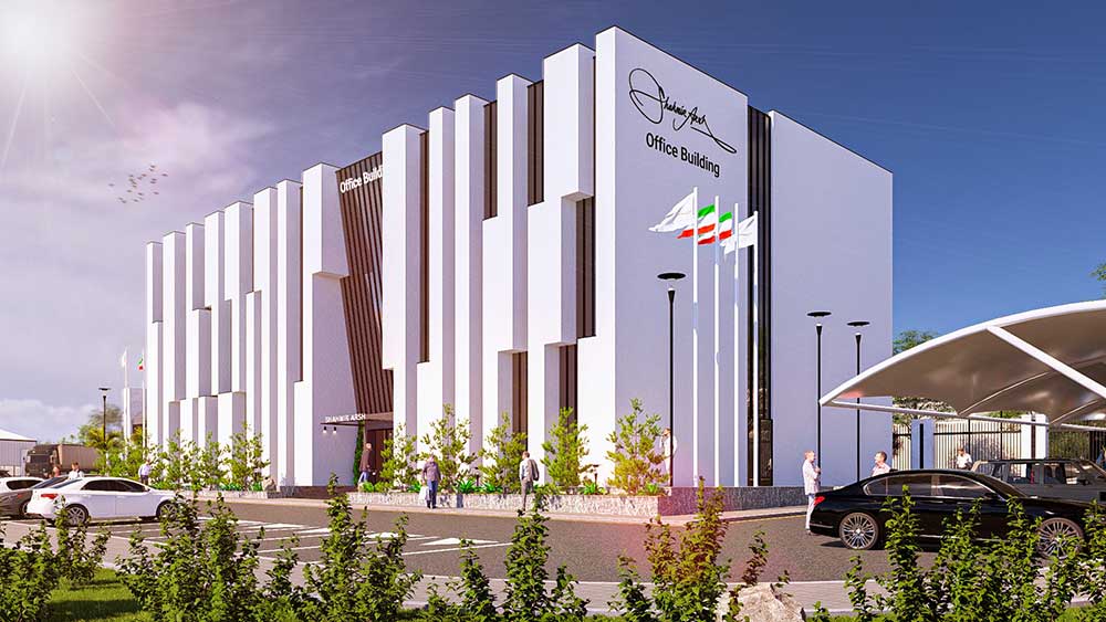 ساختمان اداری مدرن کارخانه در ۳ طبقه با زیربنای ۳۰۰۰ مترمربع بوده که از معماری شاخص و کاملا مدرن برخوردار است. نمای اصلی ساختمان رو به غرب بوده و ورودی آن از همین ضلع می باشد. در نمای ساختمان برای جلوگیری از ورود نور شدید آفتاب از معماری خطوط عمدی بصورت نوارهای عمودی و شیشه های هوشمند با ضریب انتقال انرژی حداقلی استفاده شده است. مصالح اصلی نمای ساختمان اداری کارخانه شیشه و سنگ مرمریت سفید می باشد. درصد استفاده از رنگ سفید در نما نسبت به رنگهای تیره بیشتر است. این موضوع تا حدود زیادی در عدم جذب انرژی گرمایی تاثیر دارد. ساختمان اداری و مدیریت کارخانه در طبقه همکف شامل لابی، فضای نگهبانی، نمایشگاه محصولات و فضاهای ادری است. دسترسی های عمودی با طبقات بالا از طریق پله شیشه ای و آسانسور انجام می شود. در طبقات اول و دوم فضاهای اداری و اتاق های مدیریت کارخانه جانمایی می شوند. همچنین در طبقه دوم یک سالن کنفرانس برای حدود ۶۰ نفر طراحی شده است.